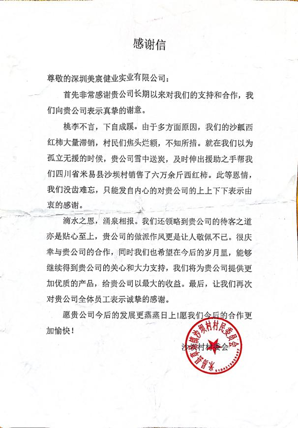 感谢美思康宸旗下APP 美宸健业致力于助农扶贫,短短时间助力四川米易番茄销售60000斤,共计30多吨,解决了疫情期间价格暴跌甚至滞留田间的米易番茄,为当地农民一解燃眉之急。村民们带着浓浓的感谢之情授予《深圳美宸健业实业有限公司 爱心助农优秀企业》荣誉奖牌并亲笔手写感谢信。